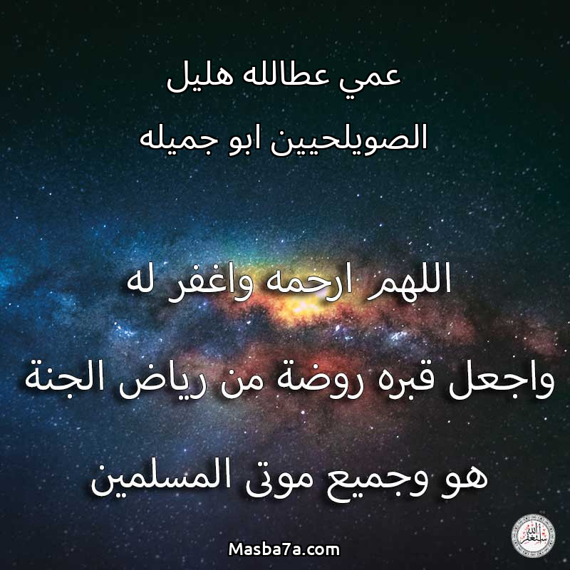 اللهم ارحم ( عمي عطالله هليل الصويلحيين ابو جميله ) وانس وحشته واجمعنا به في جنتك ، اللهم ارحمه بقدر شوقنا له اللهم ارحمه واغفر له .