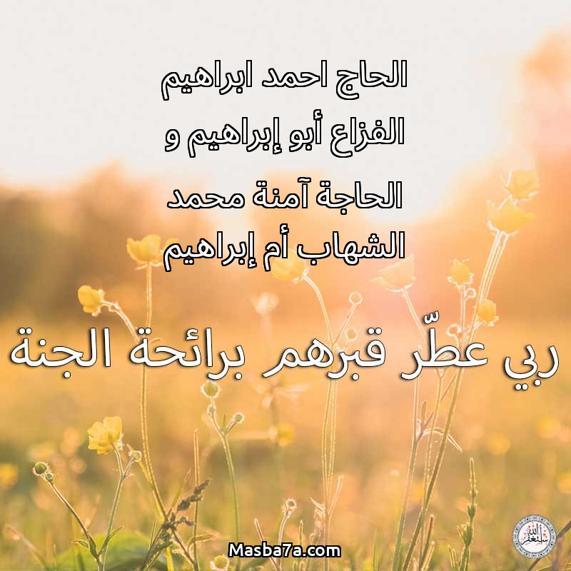 اللهم ارحم ( الحاج احمد ابراهيم الفزاع أبو إبراهيم و الحاجة آمنة محمد الشهاب أم إبراهيم ) وانس وحشتهم واجمعنا بهم في جنتك ، اللهم ارحمهم بقدر شوقنا لهم اللهم ارحمهم واغفر لهم.