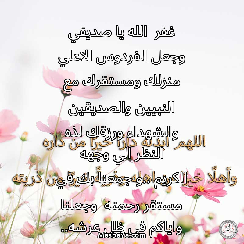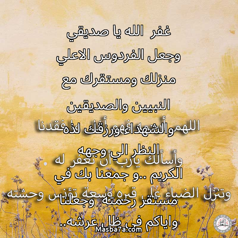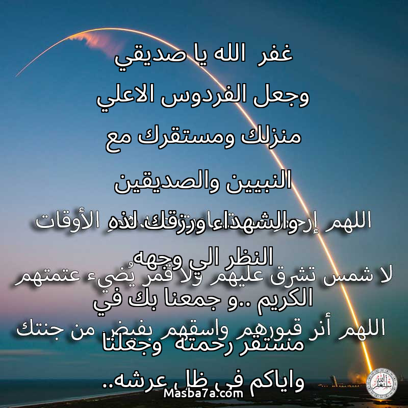 دعاء عن روح المرحوم غفر الله يا صديقي وجعل الفردوس الاعلي منزلك ومستقرك مع النبيين والصديقين والشهداء ورزقك لذه النظر الي وجهه الكريم ..و جمعنا بك في مستقر رحمته وجعلنا واياكم في ظل عرشه..
