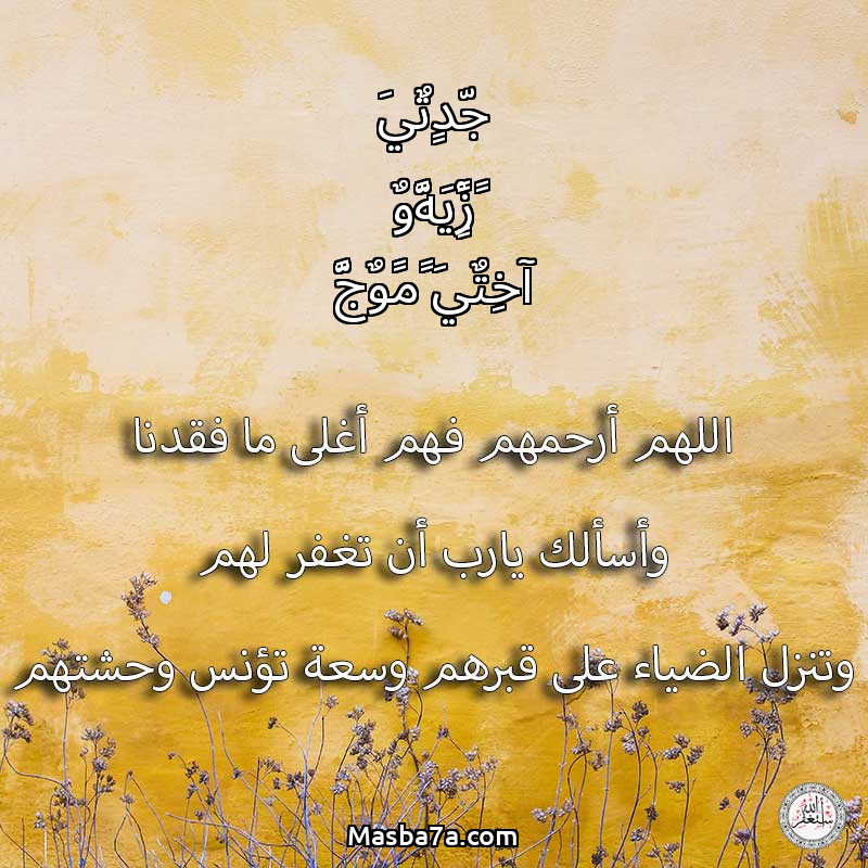 اللهم ارحم ( جّدٍتٌيَ «زٍکْيَهّ»وٌ آخِتٌيَ «مًوٌجّ» ) وانس وحشتهم واجمعنا بهم في جنتك ، اللهم ارحمهم بقدر شوقنا لهم اللهم ارحمهم واغفر لهم.