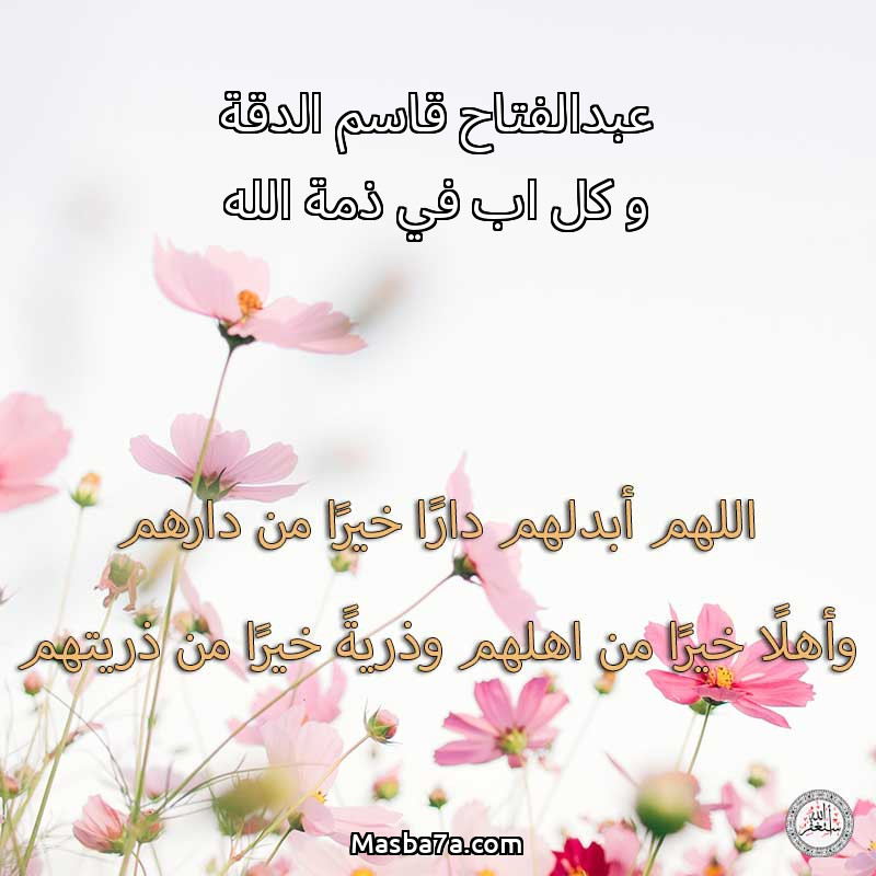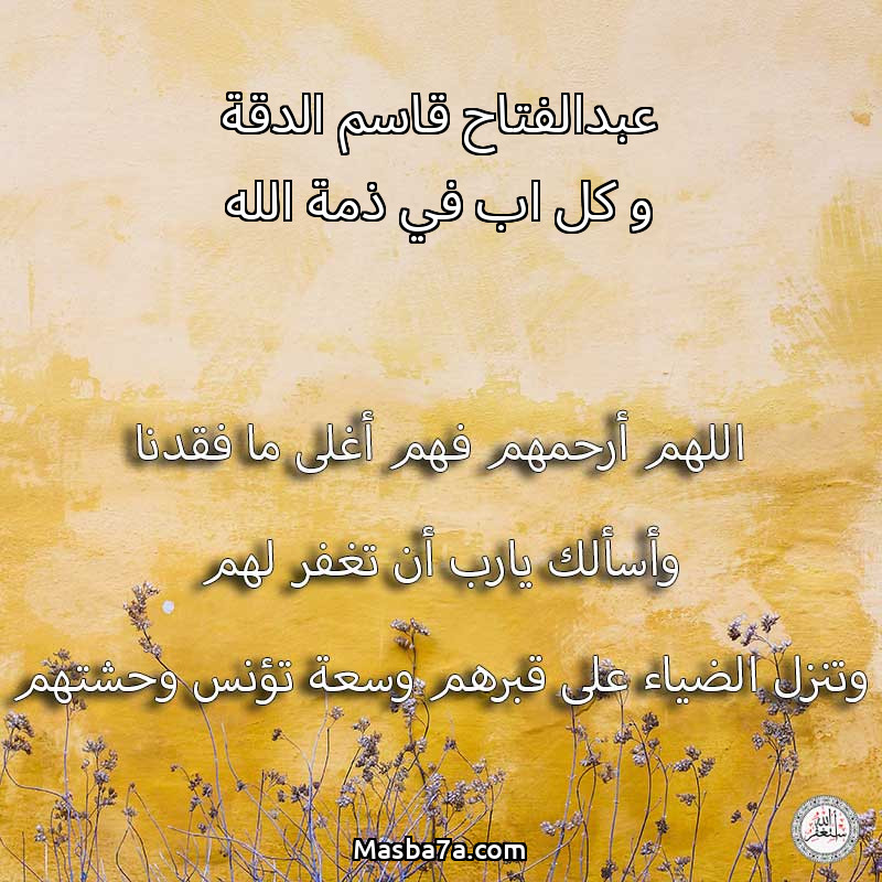 اللهم ارحم ( عبدالفتاح قاسم الدقة و كل اب في ذمة الله ) وانس وحشتهم واجمعنا بهم في جنتك ، اللهم ارحمهم بقدر شوقنا لهم اللهم ارحمهم واغفر لهم.