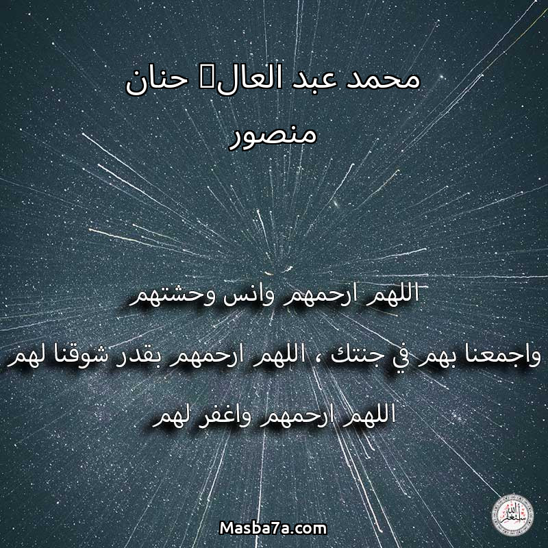 اللهم ارحم ( محمد عبد العال" حنان منصور ) وانس وحشتهم واجمعنا بهم في جنتك ، اللهم ارحمهم بقدر شوقنا لهم اللهم ارحمهم واغفر لهم.