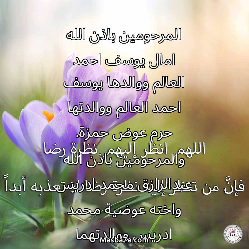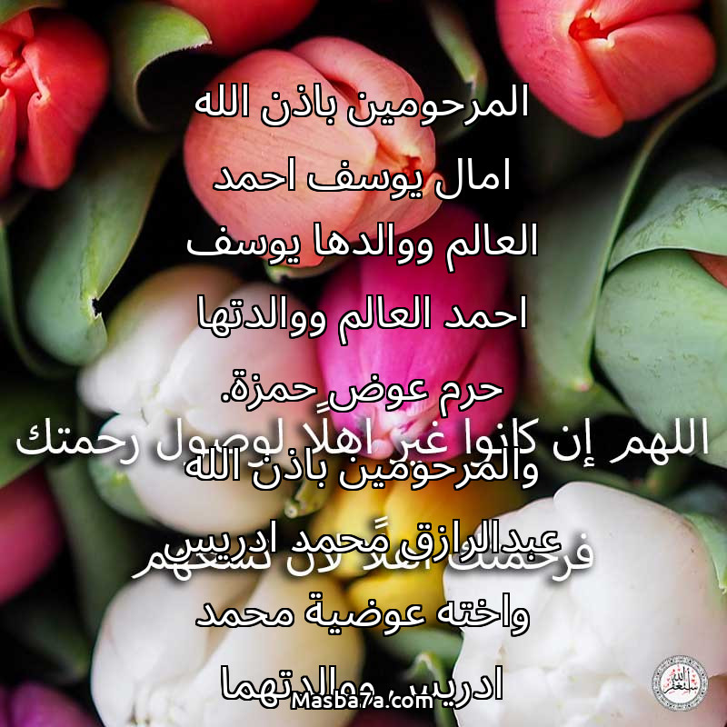 اللهم ارحم ( المرحومين باذن الله امال يوسف احمد العالم ووالدها يوسف احمد العالم ووالدتها حرم عوض حمزة. والمرحومين باذن الله عبدالرازق محمد ادريس واخته عوضية محمد ادريس ووالدتهما خديجة حافظ ووالديهما محمد ادريس. ) وانس وحشتهم واجمعنا بهم في جنتك ، اللهم ارحمهم بقدر شوقنا لهم اللهم ارحمهم واغفر لهم.