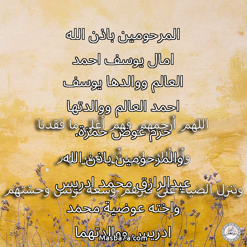 دعاء عن أرواح المرحومين المرحومين باذن الله امال يوسف احمد العالم ووالدها يوسف احمد العالم ووالدتها حرم عوض حمزة. والمرحومين باذن الله عبدالرازق محمد ادريس واخته عوضية محمد ادريس ووالدتهما خديجة حافظ ووالديهما محمد ادريس.