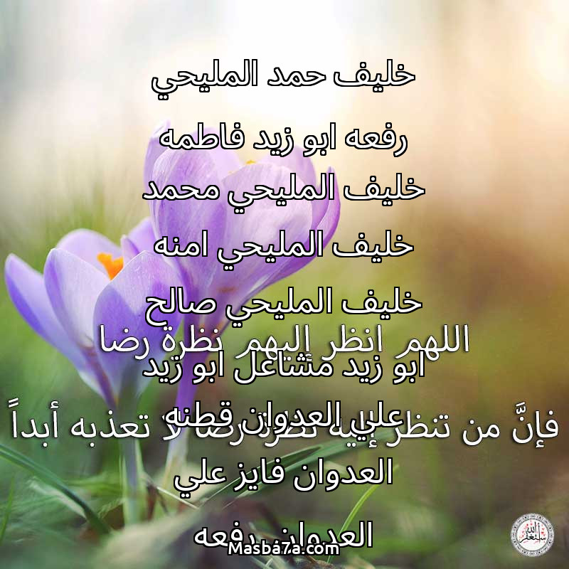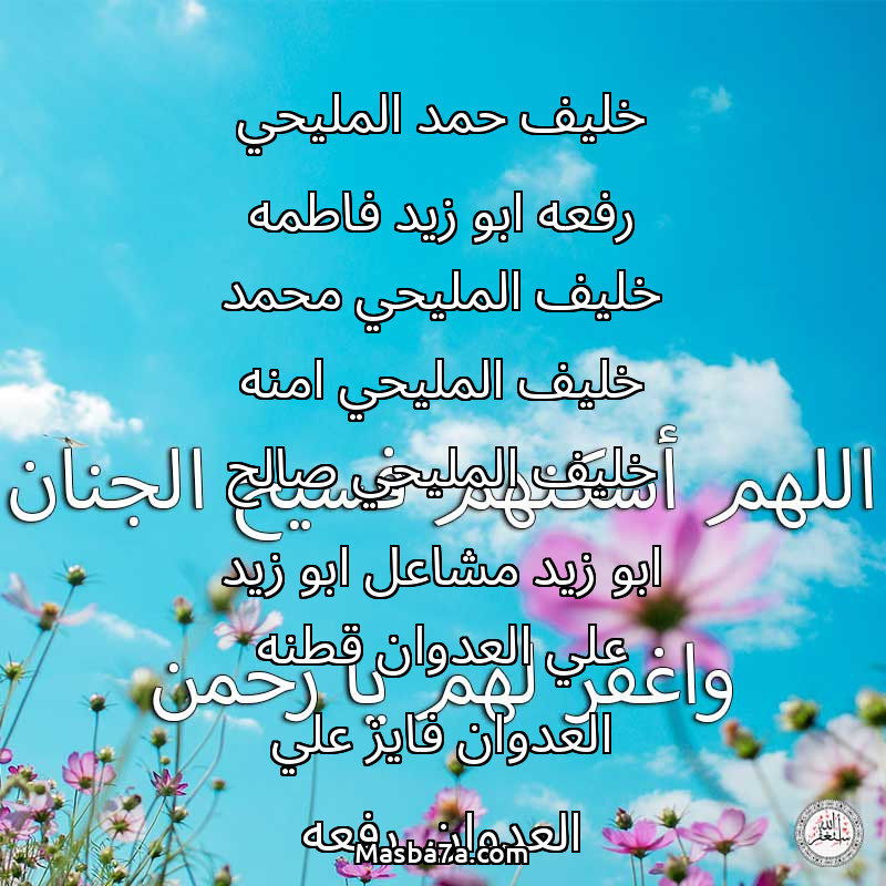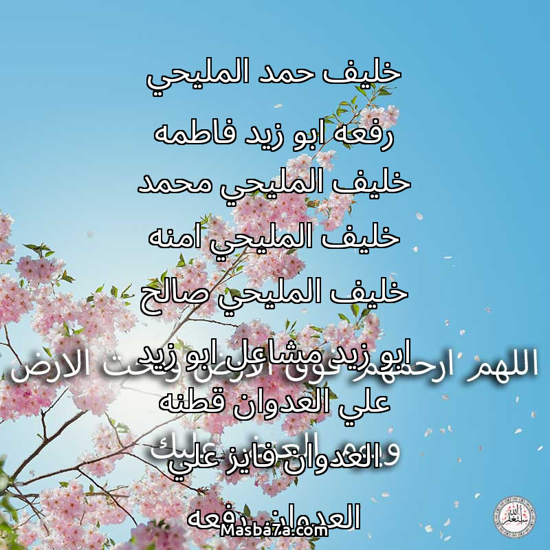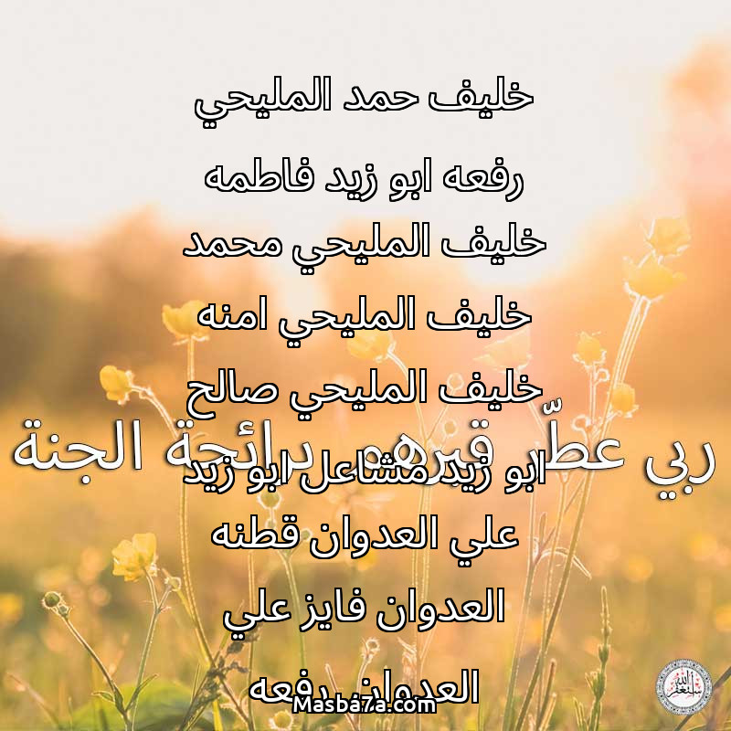دعاء عن أرواح المرحومين خليف حمد المليحي رفعه ابو زيد فاطمه خليف المليحي محمد خليف المليحي امنه خليف المليحي صالح ابو زيد مشاعل ابو زيد علي العدوان قطنه العدوان فايز علي العدوان رفعه العدوان حازم العدوان فيصل العدوان