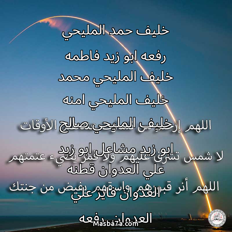 اللهم ارحم ( خليف حمد المليحي رفعه ابو زيد فاطمه خليف المليحي محمد خليف المليحي امنه خليف المليحي صالح ابو زيد مشاعل ابو زيد علي العدوان قطنه العدوان فايز علي العدوان رفعه العدوان حازم العدوان فيصل العدوان ) وانس وحشتهم واجمعنا بهم في جنتك ، اللهم ارحمهم بقدر شوقنا لهم اللهم ارحمهم واغفر لهم.