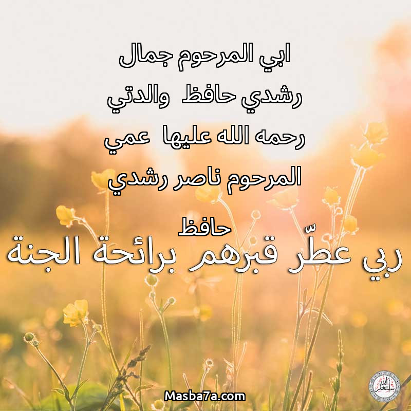 اللهم ارحم ( ابي المرحوم جمال رشدي حافظ -والدتي رحمه الله عليها -عمي المرحوم ناصر رشدي حافظ ) وانس وحشتهم واجمعنا بهم في جنتك ، اللهم ارحمهم بقدر شوقنا لهم اللهم ارحمهم واغفر لهم.