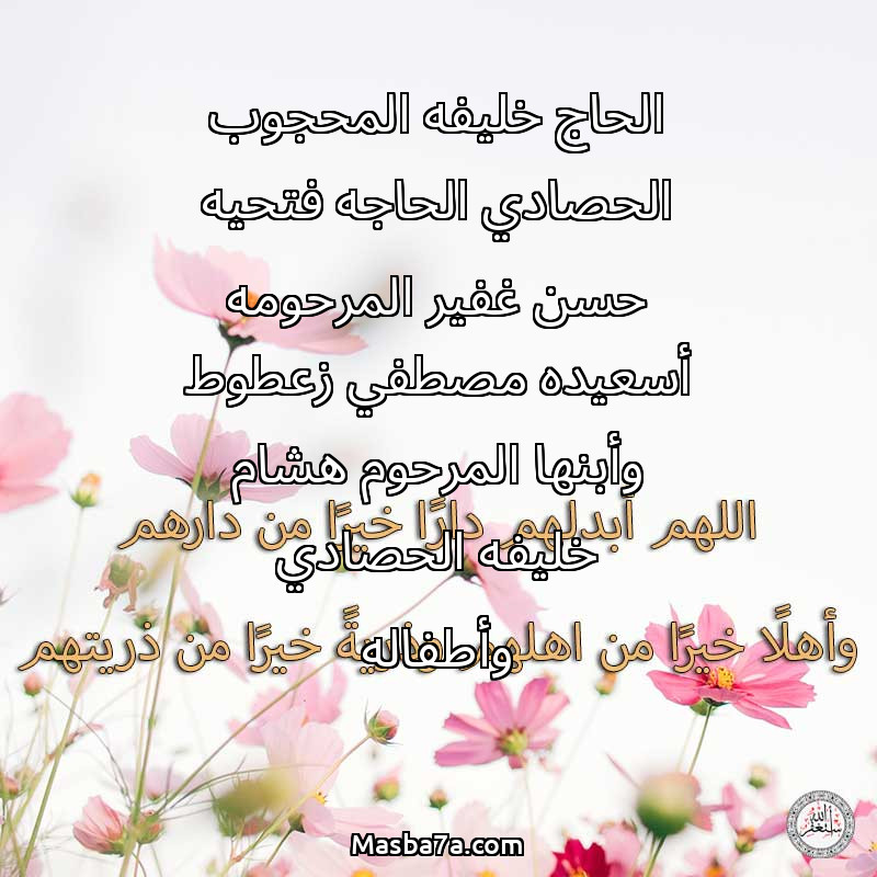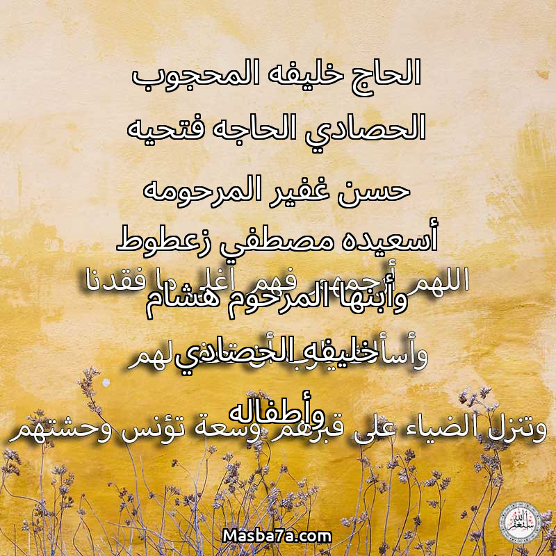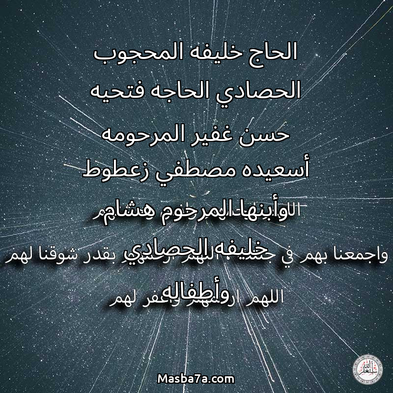 دعاء عن أرواح المرحومين الحاج خليفه المحجوب الحصادي الحاجه فتحيه حسن غفير المرحومه أسعيده مصطفي زعطوط وأبنها المرحوم هشام خليفه الحصادي وأطفاله
