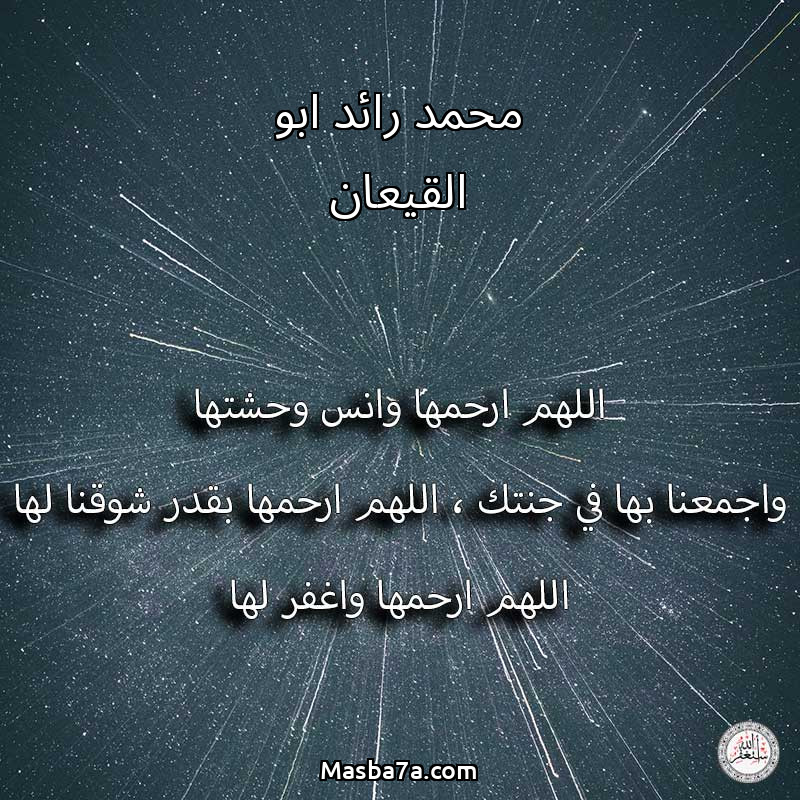 اللهم ارحم ( محمد رائد ابو القيعان ) وانس وحشتها واجمعنا بها في جنتك ، اللهم ارحمها بقدر شوقنا لها اللهم ارحمها واغفر لها .