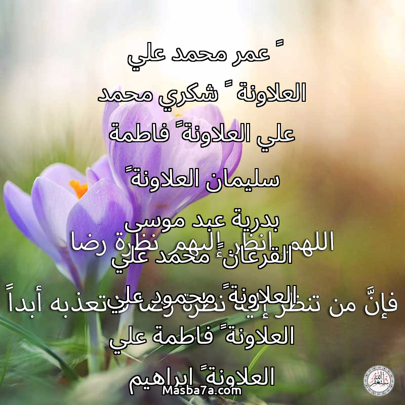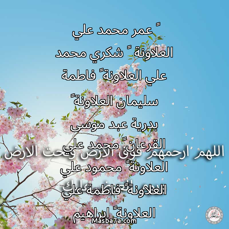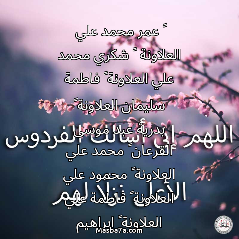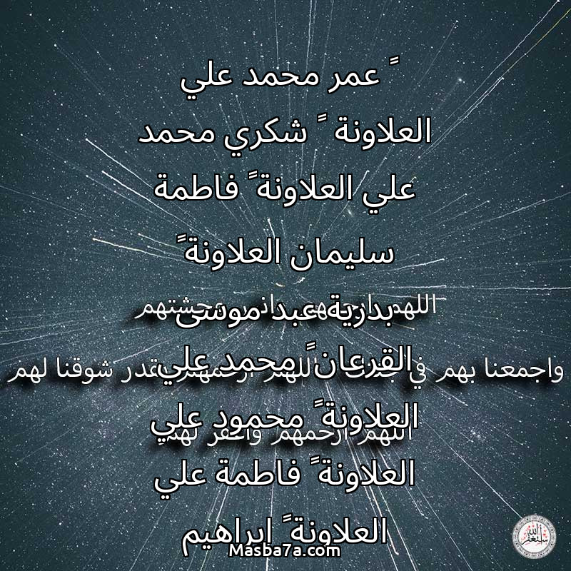 دعاء عن أرواح المرحومين ١-عمر محمد علي العلاونة ٢-شكري محمد علي العلاونة ٣-فاطمة سليمان العلاونة ٤-بدرية عبد موسى القرعان ٥-محمد علي العلاونة ٦-محمود علي العلاونة ٧-فاطمة علي العلاونة ٨-ابراهيم سليمان العلاونة ٩-محسن قاسم العلاونة ١٠-محمد الظاهر العلاونة ١١-خلود محسن قاسم العلاونة ١٢-فتحية محسن قاسم العلاونة ١٣-امنة علي محمد العلاونة
