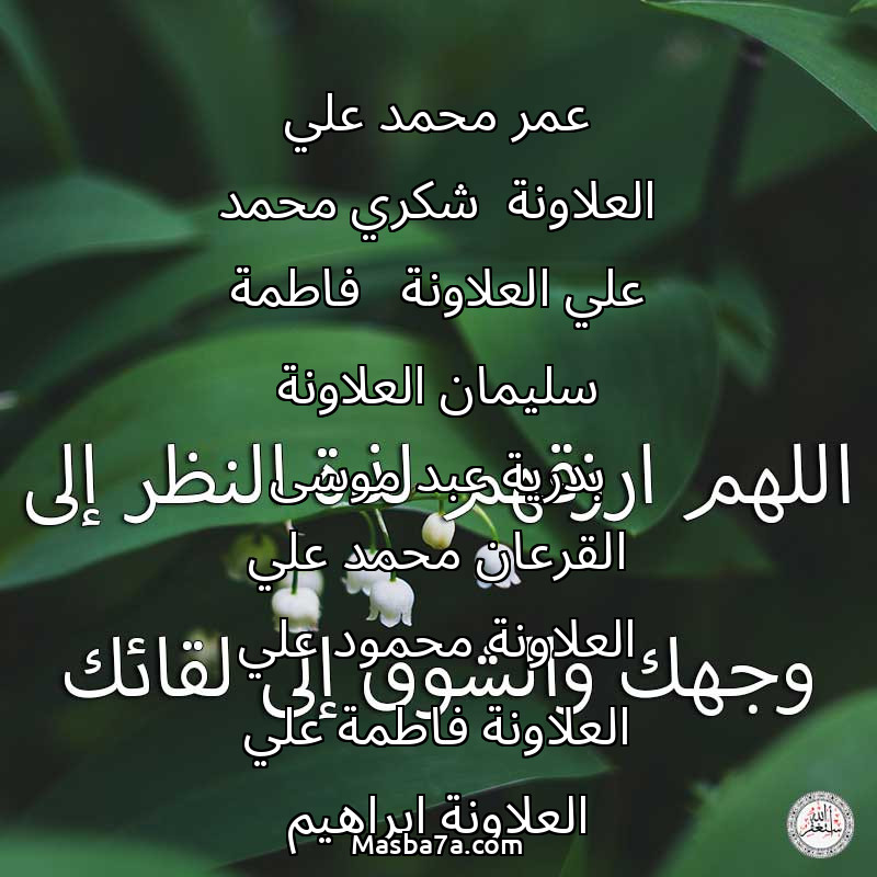 اللهم ارحم ( عمر محمد علي العلاونة شكري محمد علي العلاونة فاطمة سليمان العلاونة بدرية عبد موسى القرعان محمد علي العلاونة محمود علي العلاونة فاطمة علي العلاونة ابراهيم سليمان العلاونة محسن قاسم العلاونة محمد الظاهر العلاونة خلود محسن قاسم العلاونة فتحية محسن قاسم العلاونة امنة علي محمد العلاونة ) وانس وحشتهم واجمعنا بهم في جنتك ، اللهم ارحمهم بقدر شوقنا لهم اللهم ارحمهم واغفر لهم.