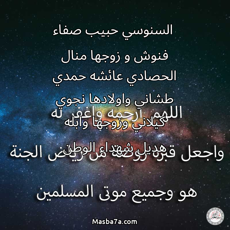 دعاء عن روح المرحوم السنوسي حبيب صفاء فنوش و زوجها منال الحصادي عائشه حمدي طشاني واولادها نجوي كيلاني وزوجها وابله هديل شهداء الوطن