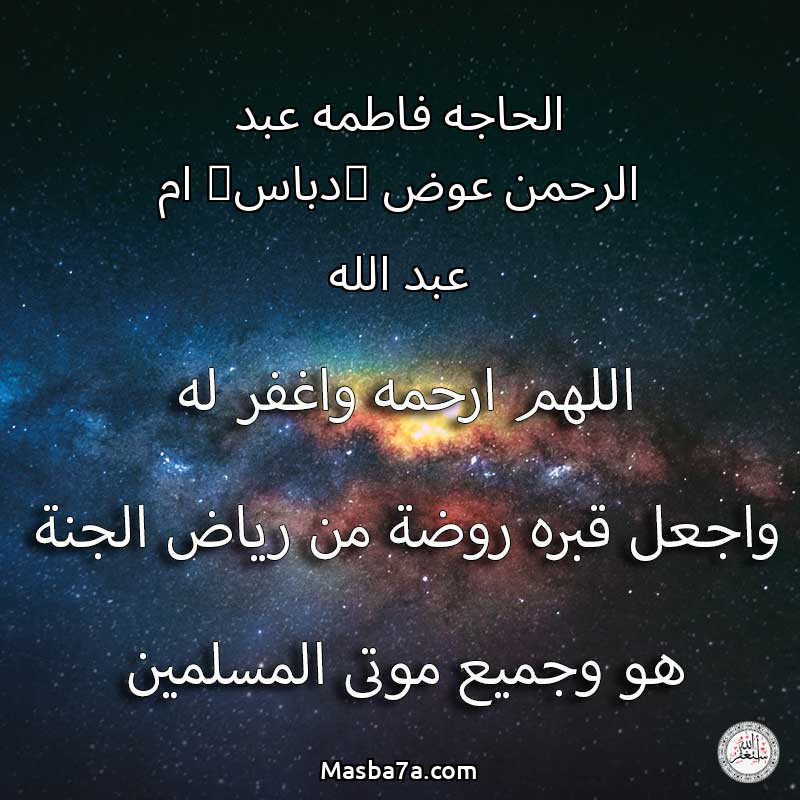 اللهم ارحم ( الحاجه فاطمه عبد الرحمن عوض (دباس) ام عبد الله ) وانس وحشته واجمعنا به في جنتك ، اللهم ارحمه بقدر شوقنا له اللهم ارحمه واغفر له .