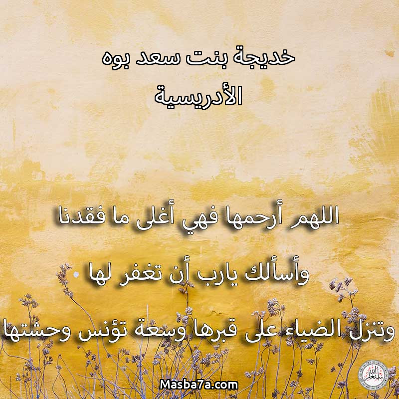اللهم ارحم ( خديجة بنت سعد بوه الأدريسية ) وانس وحشتها واجمعنا بها في جنتك ، اللهم ارحمها بقدر شوقنا لها اللهم ارحمها واغفر لها .