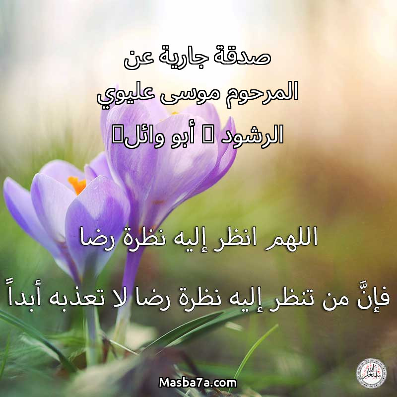 اللهم ارحم ( صدقة جارية عن المرحوم موسى عليوي الرشود ( أبو وائل) ) وانس وحشته واجمعنا به في جنتك ، اللهم ارحمه بقدر شوقنا له اللهم ارحمه واغفر له .