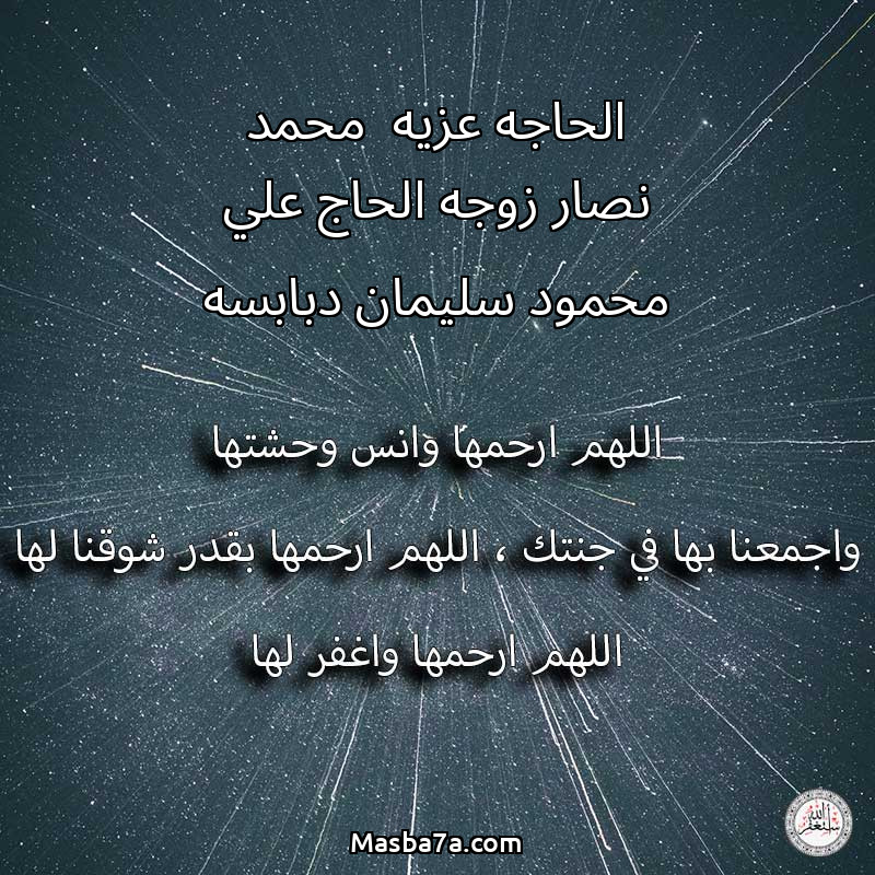 اللهم ارحم ( الحاجه عزيه محمد نصار زوجه الحاج علي محمود سليمان دبابسه ) وانس وحشتها واجمعنا بها في جنتك ، اللهم ارحمها بقدر شوقنا لها اللهم ارحمها واغفر لها .