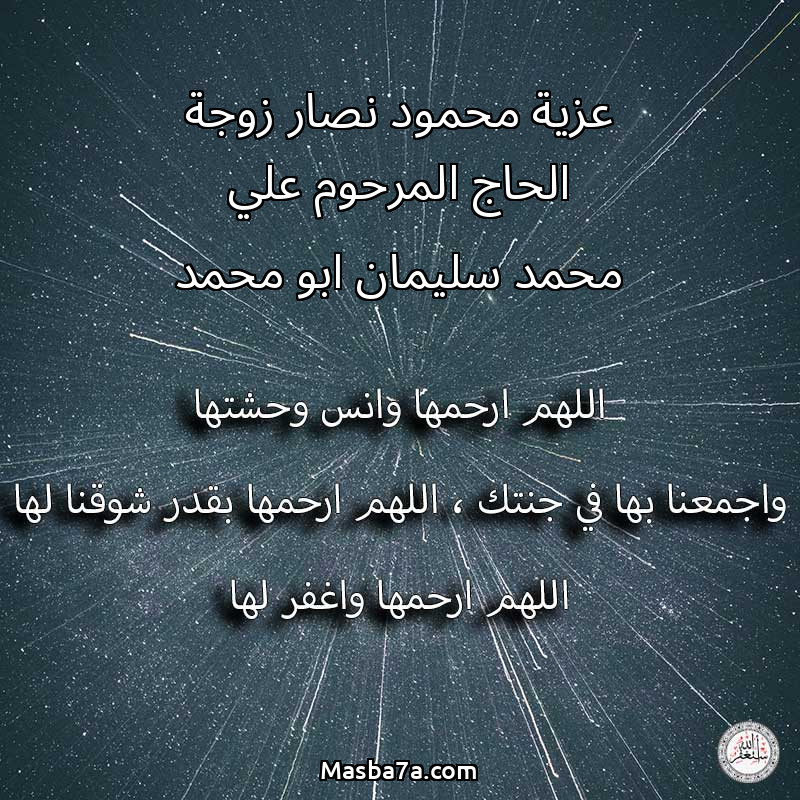 اللهم ارحم ( عزية محمود نصار زوجة الحاج المرحوم علي محمد سليمان ابو محمد ) وانس وحشتها واجمعنا بها في جنتك ، اللهم ارحمها بقدر شوقنا لها اللهم ارحمها واغفر لها .