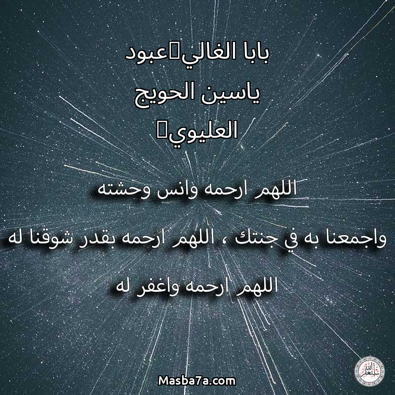 اللهم ارحم ( بابا الغالي(عبود ياسين الحويج العليوي) ) وانس وحشته واجمعنا به في جنتك ، اللهم ارحمه بقدر شوقنا له اللهم ارحمه واغفر له .