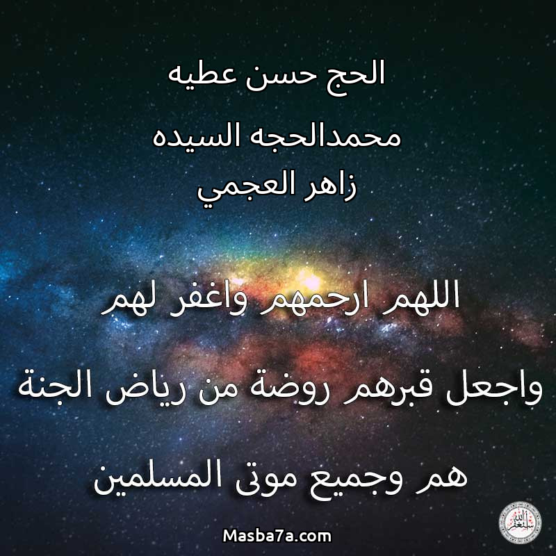 اللهم ارحم ( الحج حسن عطيه محمدالحجه السيده زاهر العجمي ) وانس وحشتهم واجمعنا بهم في جنتك ، اللهم ارحمهم بقدر شوقنا لهم اللهم ارحمهم واغفر لهم.