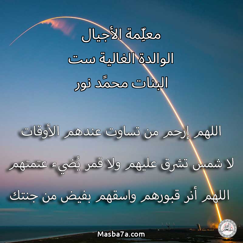 اللهم ارحم ( معلِّمة الأجيال الوالدة الغالية ست البنات محمًد نور ) وانس وحشتها واجمعنا بها في جنتك ، اللهم ارحمها بقدر شوقنا لها اللهم ارحمها واغفر لها .