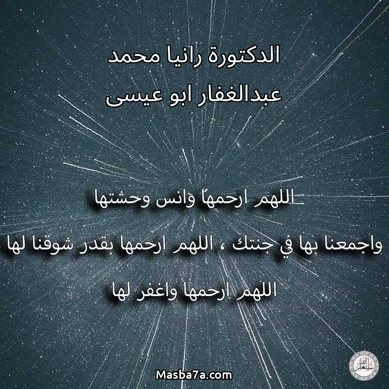 اللهم ارحم ( الدكتورة رانيا محمد عبدالغفار ابو عيسى ) وانس وحشتها واجمعنا بها في جنتك ، اللهم ارحمها بقدر شوقنا لها اللهم ارحمها واغفر لها .