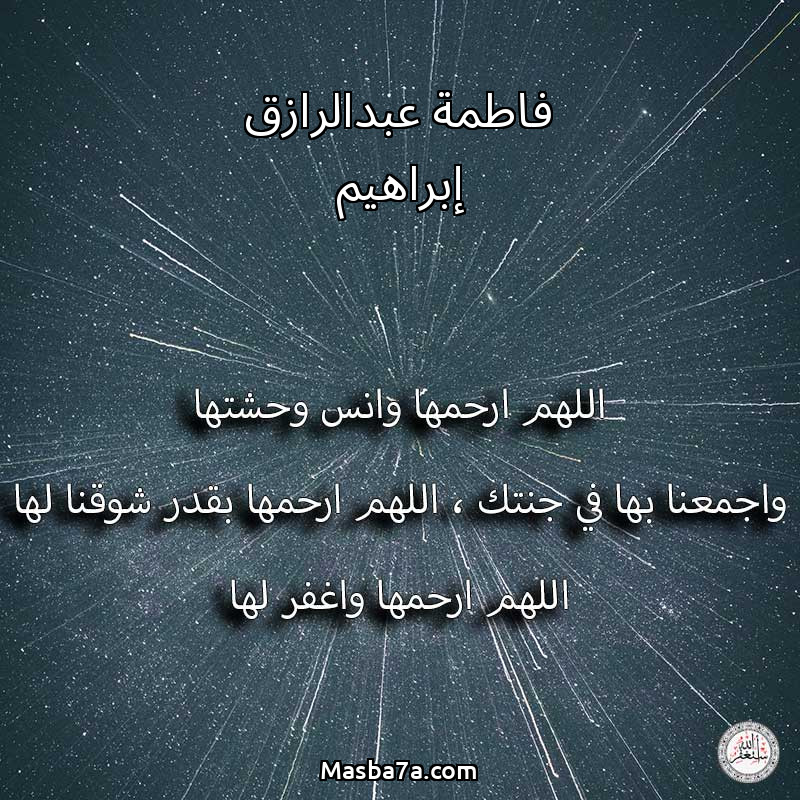 اللهم ارحم ( فاطمة عبدالرازق إبراهيم ) وانس وحشتها واجمعنا بها في جنتك ، اللهم ارحمها بقدر شوقنا لها اللهم ارحمها واغفر لها .