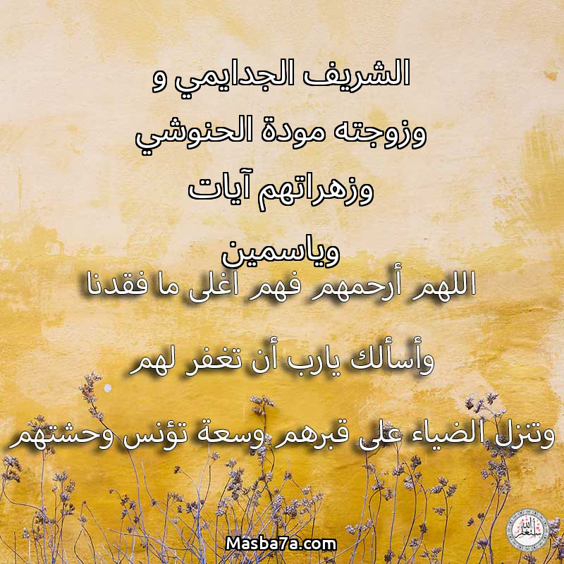 دعاء عن أرواح المرحومين الشريف الجدايمي و وزوجته مودة الحنوشي وزهراتهم آيات وياسمين
