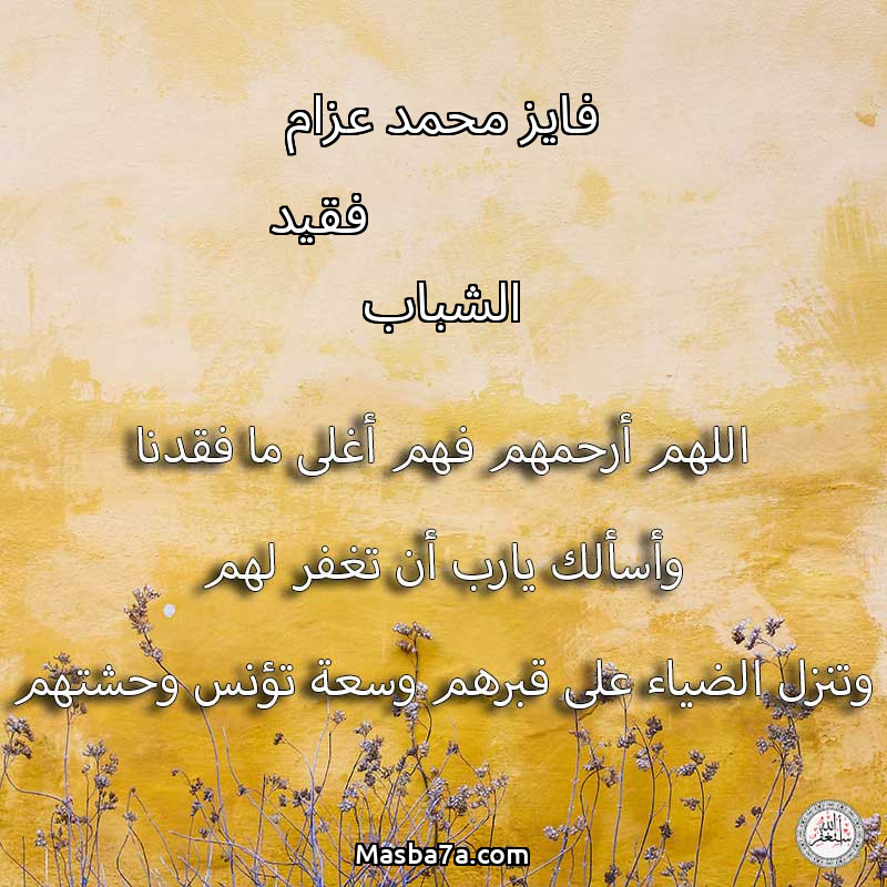 اللهم ارحم ( فايز محمد عزام فقيد الشباب/أحمد بهجت خليف ) وانس وحشتهم واجمعنا بهم في جنتك ، اللهم ارحمهم بقدر شوقنا لهم اللهم ارحمهم واغفر لهم.