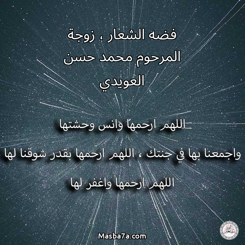 اللهم ارحم ( فضه الشعار ، زوجة المرحوم محمد حسن العويدي ) وانس وحشتها واجمعنا بها في جنتك ، اللهم ارحمها بقدر شوقنا لها اللهم ارحمها واغفر لها .