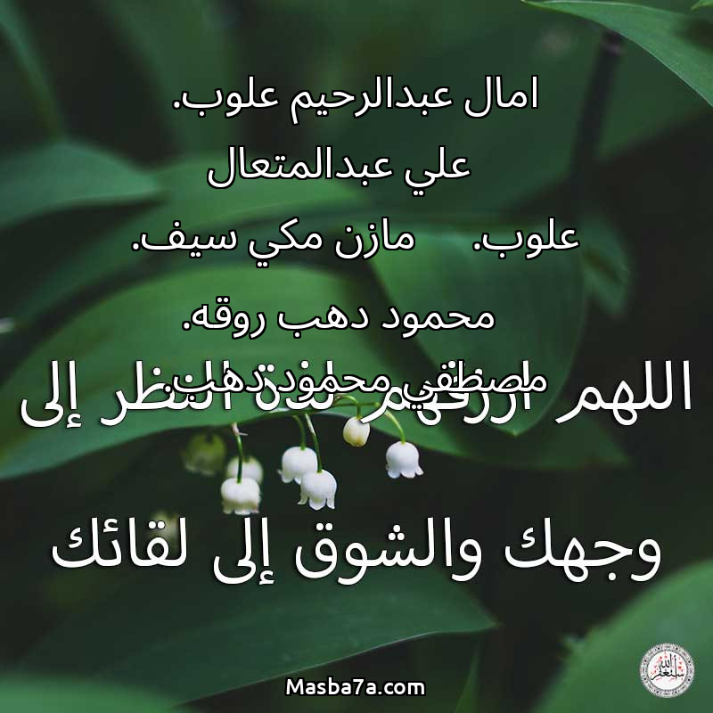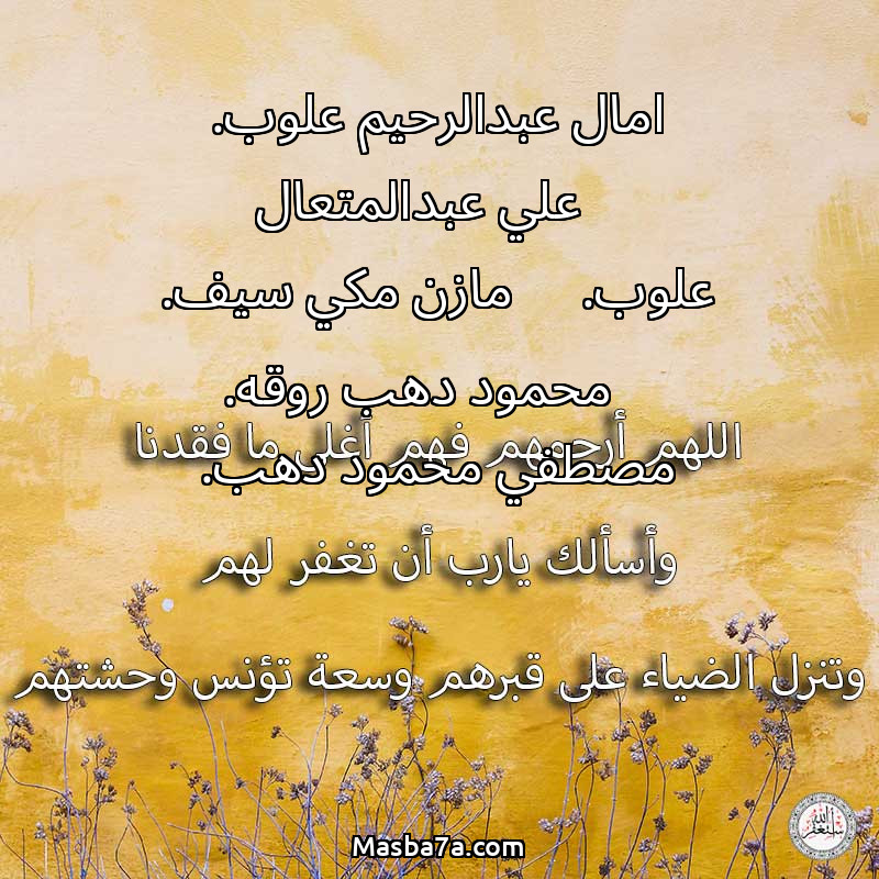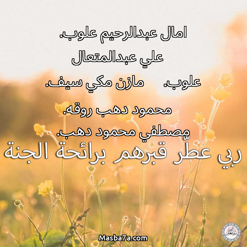 اللهم ارحم ( امال عبدالرحيم علوب. - علي عبدالمتعال علوب. - مازن مكي سيف. - محمود دهب روقه. - مصطفي محمود دهب. ) وانس وحشتهم واجمعنا بهم في جنتك ، اللهم ارحمهم بقدر شوقنا لهم اللهم ارحمهم واغفر لهم.