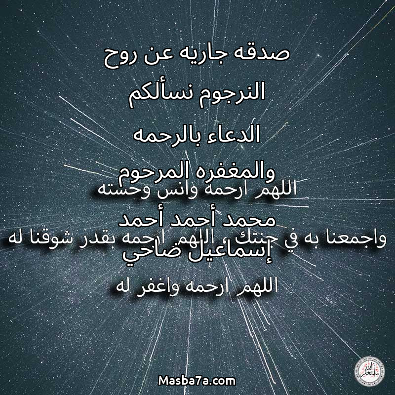 دعاء عن روح المرحوم صدقه جاريه عن روح النرجوم نسألكم الدعاء بالرحمه والمغفره المرحوم محمد أحمد أحمد إسماعيل ضاحي