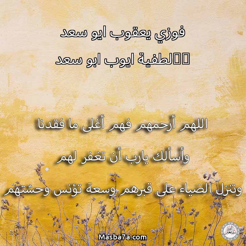 اللهم ارحم ( فوزي يعقوب ايو سعد &لطفية ايوب ابو سعد ) وانس وحشتهم واجمعنا بهم في جنتك ، اللهم ارحمهم بقدر شوقنا لهم اللهم ارحمهم واغفر لهم.