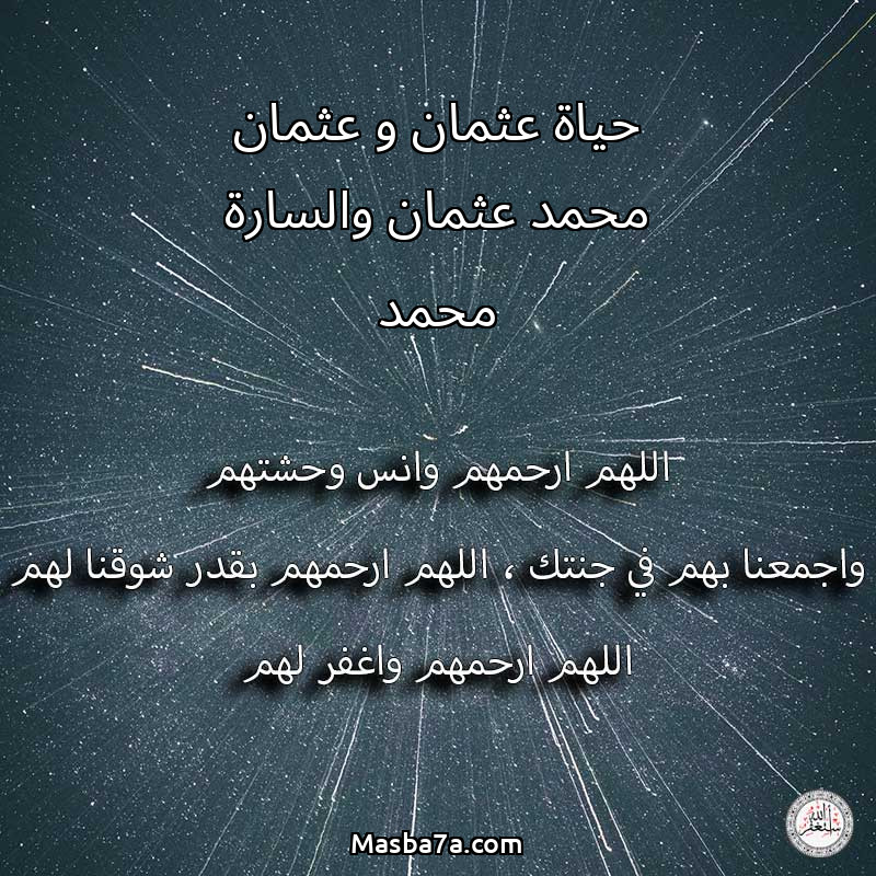 اللهم ارحم ( حياة عثمان و عثمان محمد عثمان والسارة محمد ) وانس وحشتهم واجمعنا بهم في جنتك ، اللهم ارحمهم بقدر شوقنا لهم اللهم ارحمهم واغفر لهم.