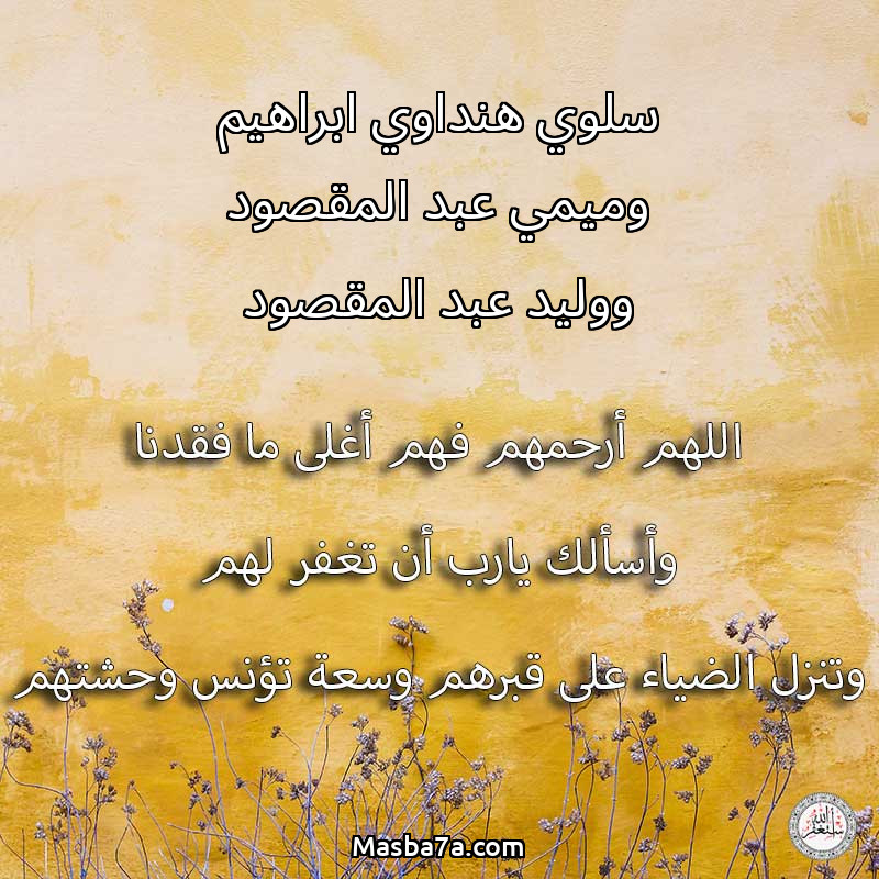 اللهم ارحم ( سلوي هنداوي ابراهيم وميمي عبد المقصود ووليد عبد المقصود ) وانس وحشتهم واجمعنا بهم في جنتك ، اللهم ارحمهم بقدر شوقنا لهم اللهم ارحمهم واغفر لهم.