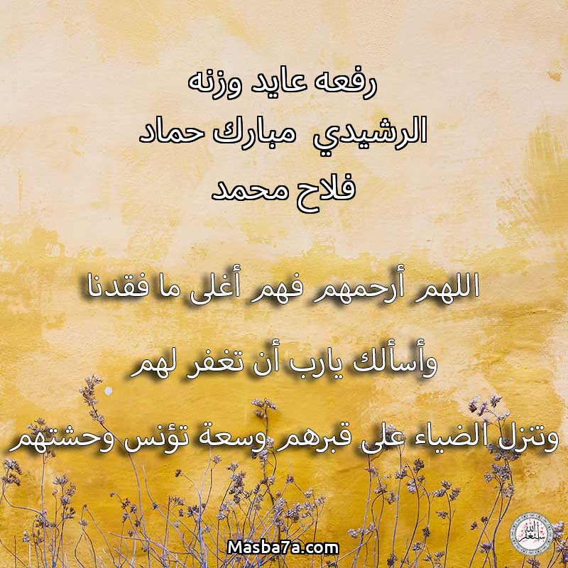 اللهم ارحم ( رفعه عايد-وزنه الرشيدي- مبارك حماد-فلاح محمد ) وانس وحشتهم واجمعنا بهم في جنتك ، اللهم ارحمهم بقدر شوقنا لهم اللهم ارحمهم واغفر لهم.