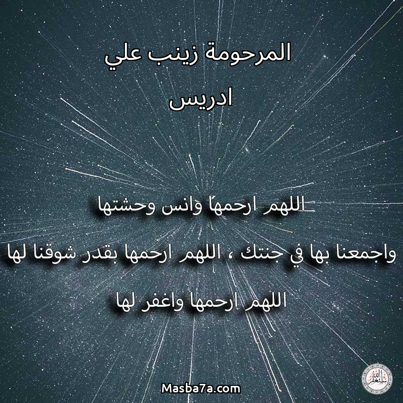 اللهم ارحم ( المرحومة زينب علي ادريس ) وانس وحشتها واجمعنا بها في جنتك ، اللهم ارحمها بقدر شوقنا لها اللهم ارحمها واغفر لها .
