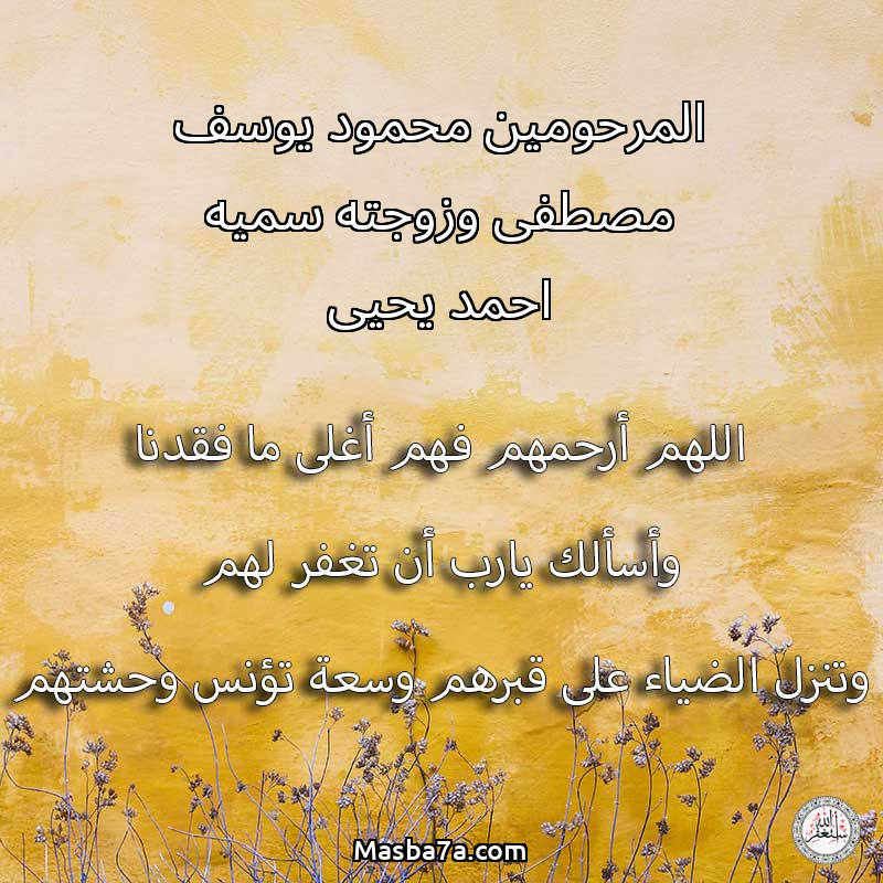 اللهم ارحم ( المرحومين محمود يوسف مصطفى وزوجته سميه احمد يحيى ) وانس وحشتهم واجمعنا بهم في جنتك ، اللهم ارحمهم بقدر شوقنا لهم اللهم ارحمهم واغفر لهم.