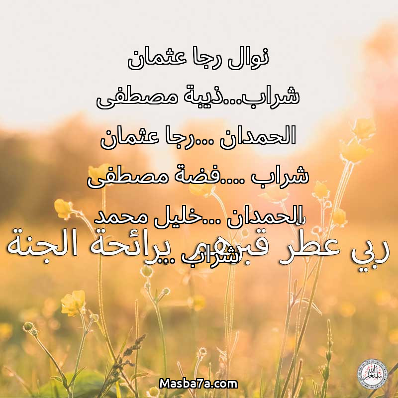 اللهم ارحم ( نوال رجا عثمان شراب...ذيبة مصطفى الحمدان ...رجا عثمان شراب ....فضة مصطفى الحمدان ...خليل محمد شراب ... ) وانس وحشتهم واجمعنا بهم في جنتك ، اللهم ارحمهم بقدر شوقنا لهم اللهم ارحمهم واغفر لهم.