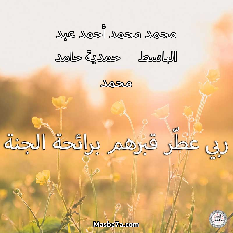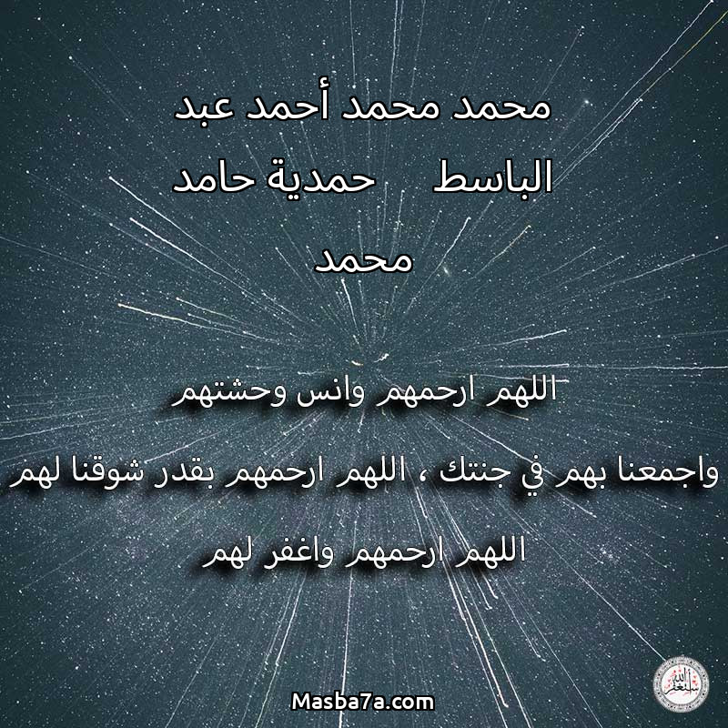 اللهم ارحم ( محمد محمد أحمد عبد الباسط حمدية حامد محمد ) وانس وحشتهم واجمعنا بهم في جنتك ، اللهم ارحمهم بقدر شوقنا لهم اللهم ارحمهم واغفر لهم.