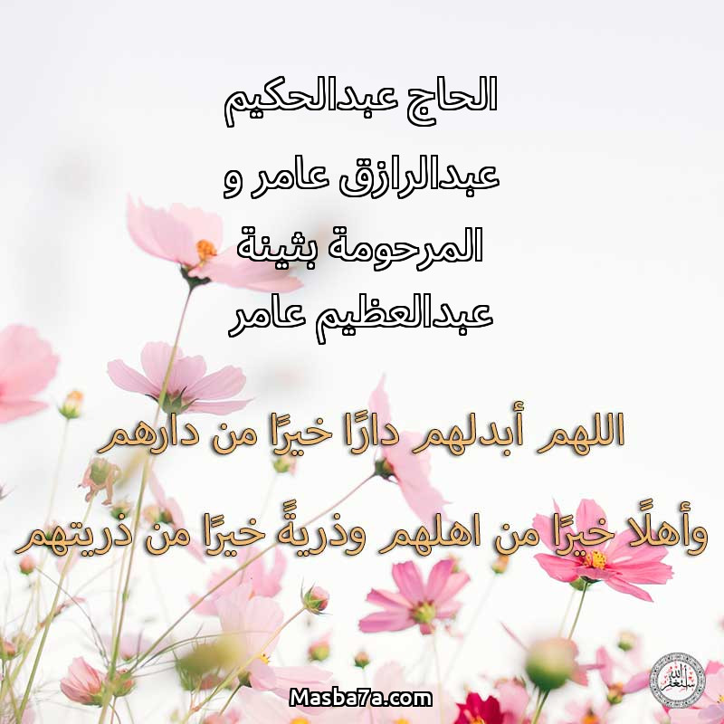 اللهم ارحم ( الحاج عبدالحكيم عبدالرازق عامر و المرحومة بثينة عبدالعظيم عامر ) وانس وحشتهم واجمعنا بهم في جنتك ، اللهم ارحمهم بقدر شوقنا لهم اللهم ارحمهم واغفر لهم.