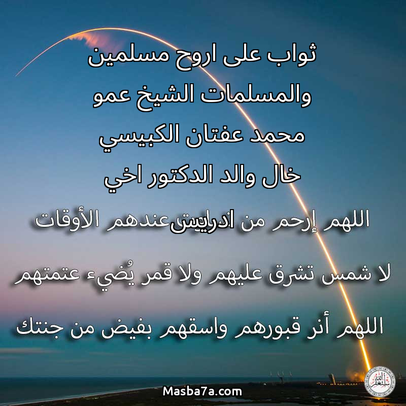 اللهم ارحم ( ثواب على اروح مسلمين والمسلمات الشيخ عمو محمد عفتان الكبيسي خال والد الدكتور اخي ادريس ) وانس وحشته واجمعنا به في جنتك ، اللهم ارحمه بقدر شوقنا له اللهم ارحمه واغفر له .