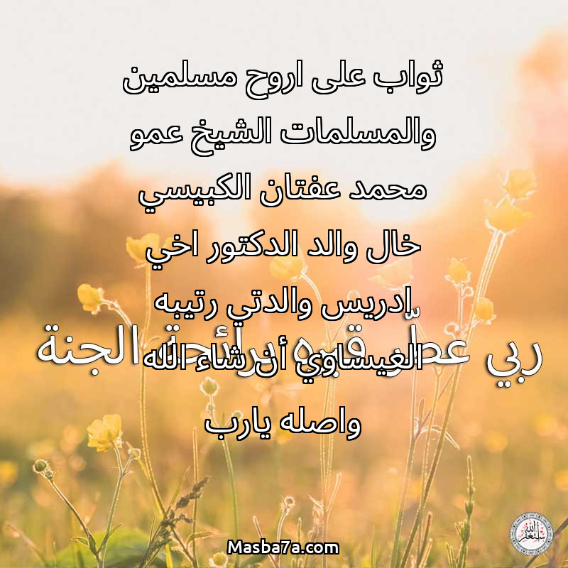 دعاء عن روح المرحوم ثواب على اروح مسلمين والمسلمات الشيخ عمو محمد عفتان الكبيسي خال والد الدكتور اخي ادريس والدتي رتيبه العيساوي أن شاء الله واصله يارب