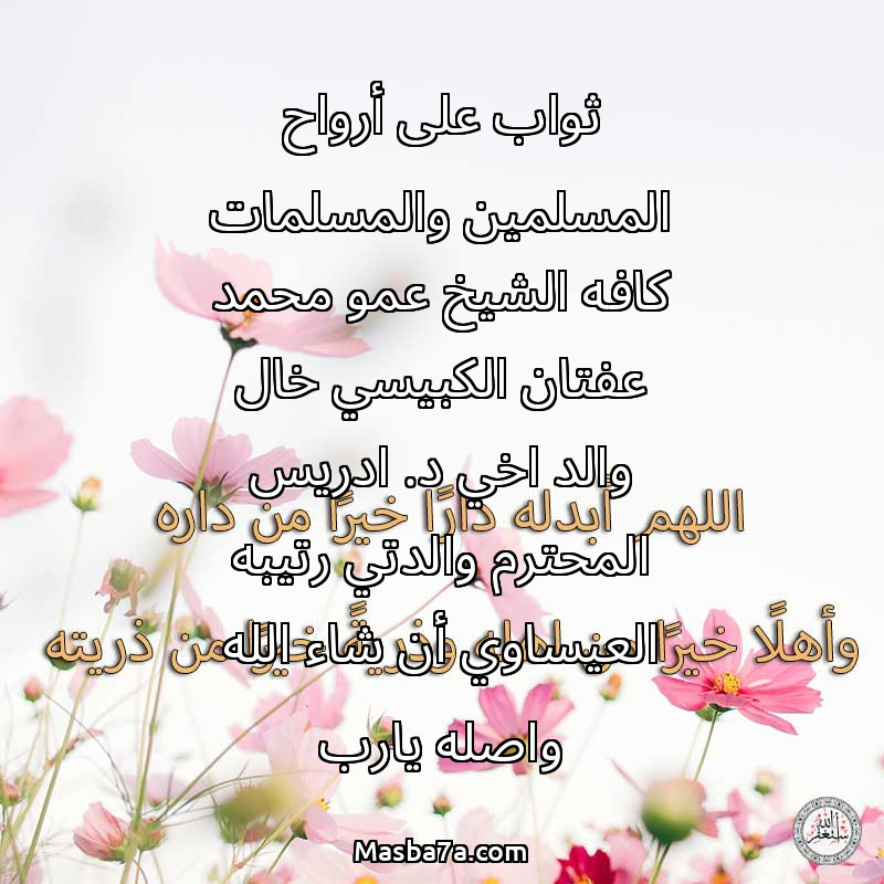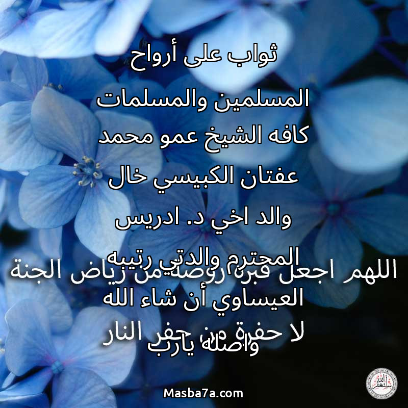 دعاء عن روح المرحوم ثواب على أرواح المسلمين والمسلمات كافه الشيخ عمو محمد عفتان الكبيسي خال والد اخي د. ادريس المحترم والدتي رتيبه العيساوي أن شاء الله واصله يارب