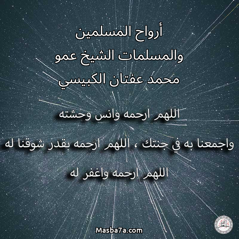 اللهم ارحم ( أرواح المسلمين والمسلمات الشيخ عمو محمد عفتان الكبيسي ) وانس وحشته واجمعنا به في جنتك ، اللهم ارحمه بقدر شوقنا له اللهم ارحمه واغفر له .