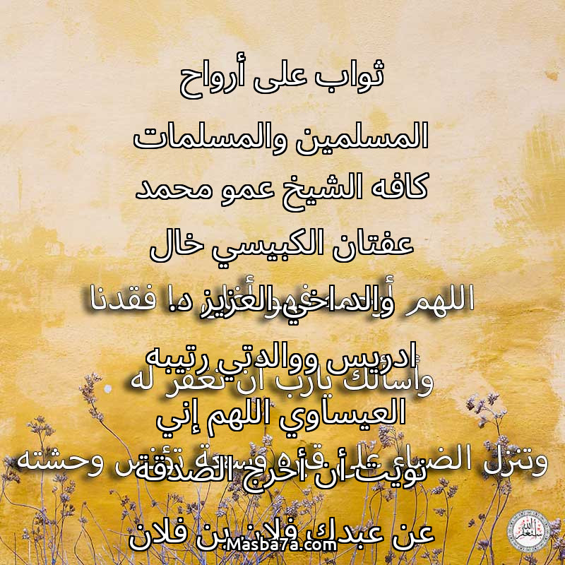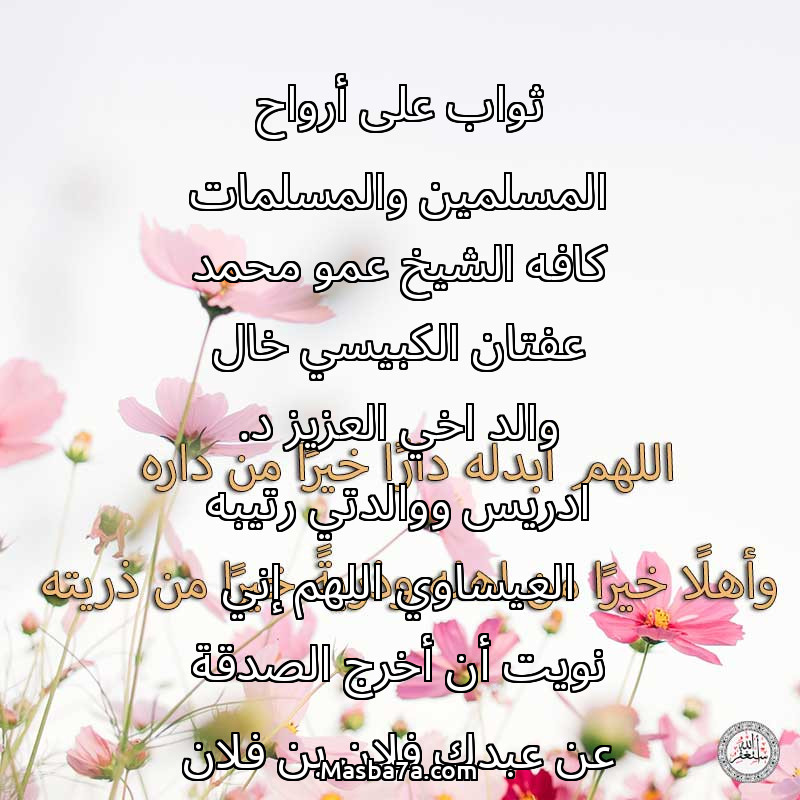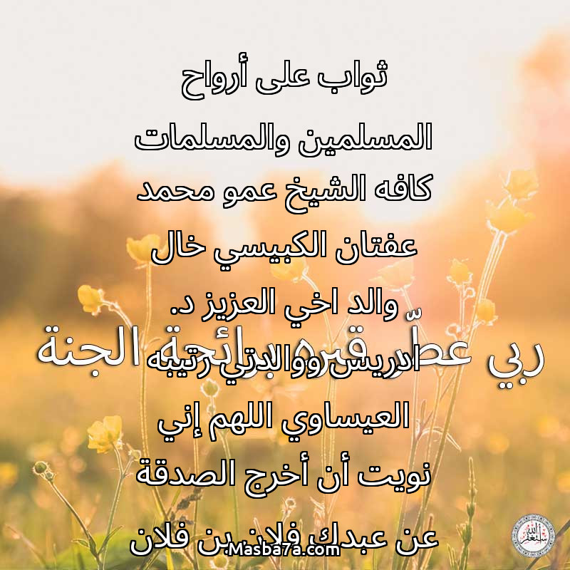 دعاء عن روح المرحوم ثواب على أرواح المسلمين والمسلمات كافه الشيخ عمو محمد عفتان الكبيسي خال والد اخي العزيز د. ادريس ووالدتي رتيبه العيساوي اللهم إني نويت أن أخرج الصدقة عن عبدك فلان بن فلان الذي رحل عنا وعن ديارنا، فوسع اللهم قبره مد بصره وانقله من دار اللحود إلى جنات الفردوس والخلود