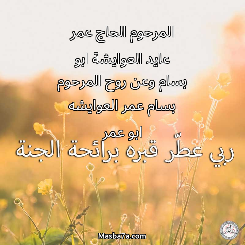 اللهم ارحم ( المرحوم الحاج عمر عايد العوايشة ابو بسام وعن روح المرحوم بسام عمر العوايشه ابو عمر ) وانس وحشته واجمعنا به في جنتك ، اللهم ارحمه بقدر شوقنا له اللهم ارحمه واغفر له .