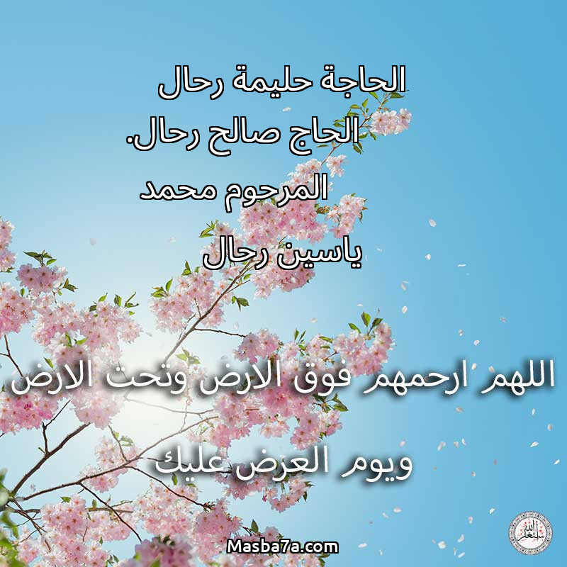 اللهم ارحم ( الحاجة حليمة رحال الحاج صالح رحال. المرحوم محمد ياسين رحال ) وانس وحشتهم واجمعنا بهم في جنتك ، اللهم ارحمهم بقدر شوقنا لهم اللهم ارحمهم واغفر لهم.