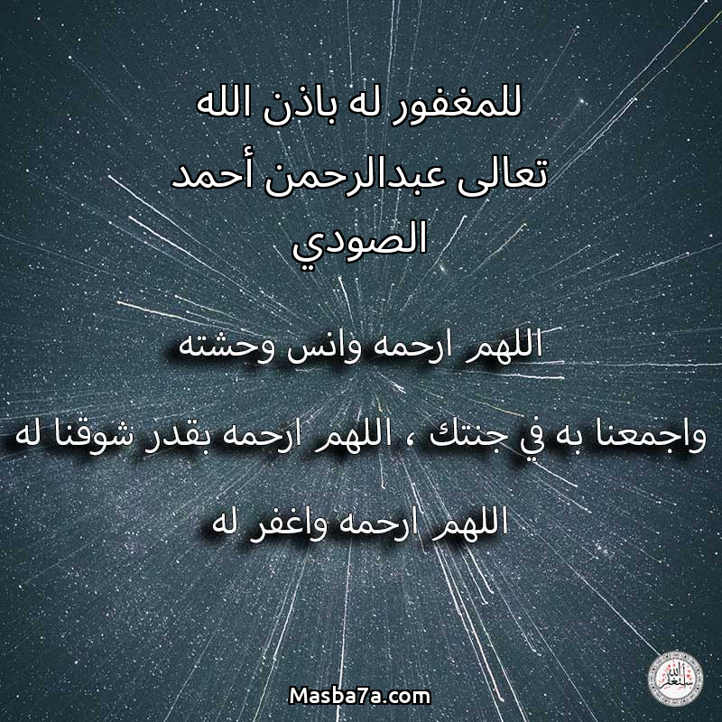 اللهم ارحم ( للمغفور له باذن الله تعالى عبدالرحمن أحمد الصودي ) وانس وحشته واجمعنا به في جنتك ، اللهم ارحمه بقدر شوقنا له اللهم ارحمه واغفر له .