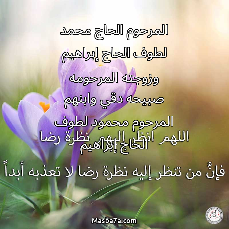 اللهم ارحم ( المرحوم الحاج محمد لطوف الحاج إبراهيم وزوجته المرحومه صبيحه دقي وابنهم المرحوم محمود لطوف الحاج إبراهيم ) وانس وحشتهم واجمعنا بهم في جنتك ، اللهم ارحمهم بقدر شوقنا لهم اللهم ارحمهم واغفر لهم.