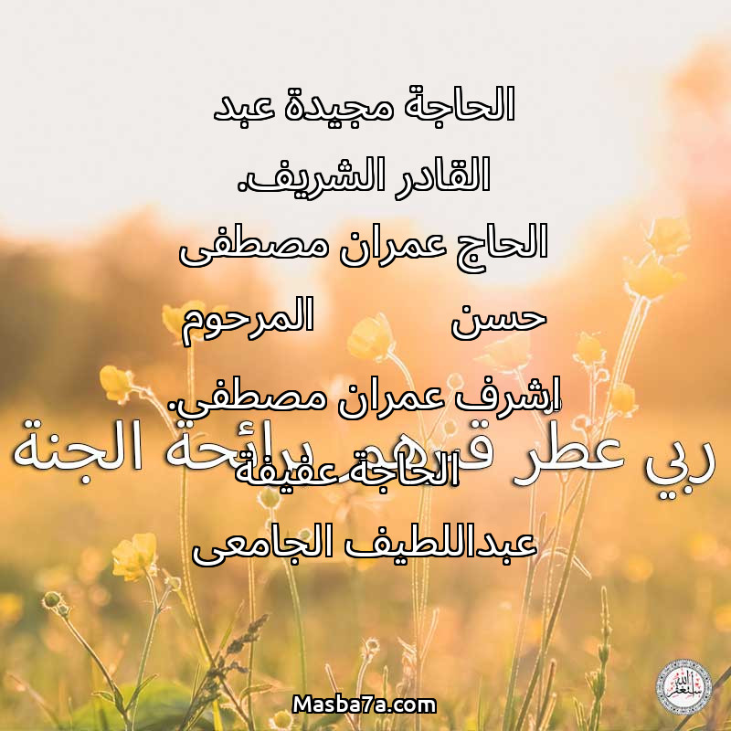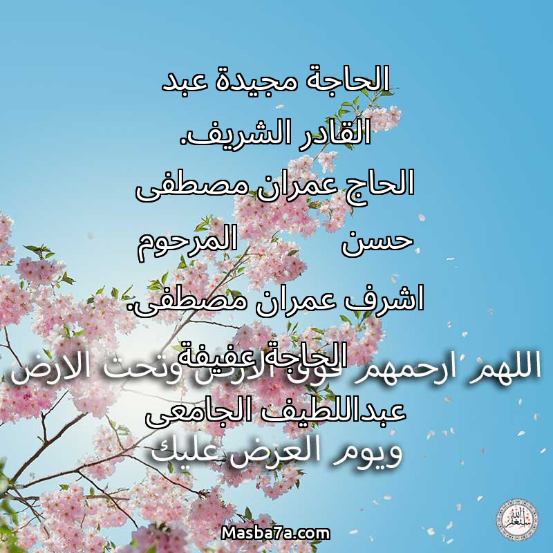 دعاء عن أرواح المرحومين الحاجة مجيدة عبد القادر الشريف. الحاج عمران مصطفى حسن المرحوم اشرف عمران مصطفى. الحاجة عفيفة عبداللطيف الجامعى